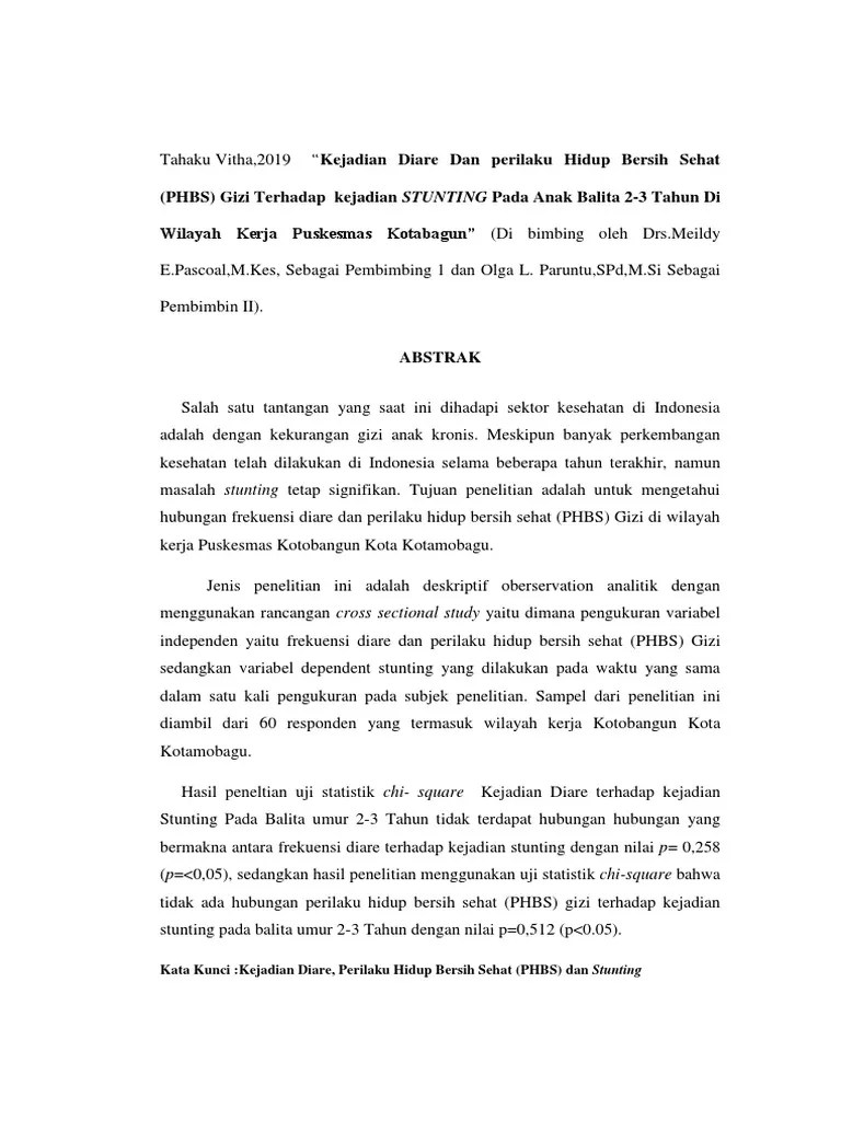 The majority of children in stunting group had the diarrheal disease frequently (72.7%), whereas children in non stunting group had the diarrheal . Kontribusi kondisi fisik lingkungan rumah dengan kejadian diare dan. Di sisi lain, stunting juga biasanya . Stunting terjadi akibat kekurangan gizi kronis yang dapat disebabkan asupan yang tidak adekuat atau adanya penyakit pada balita seperti infeksi. Hasil penelitian menunjukkan bahwa, tidak ada hubungan antara kejadian diare dengan stunting pada batita dan tidak ada hubungan antara pemberian .
