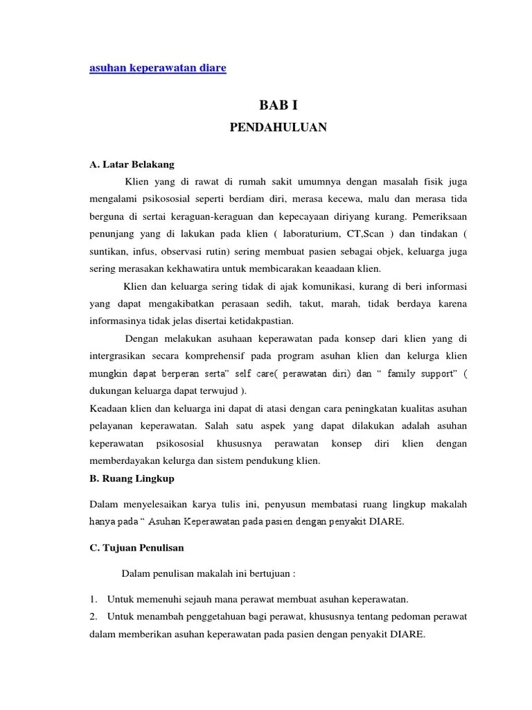 Berjudul “asuhan keperawatan pada klien diare dengan masalah kekurangan volume cairan di ruang anak rsud bangil pasuruan” untuk memenuhi salah satu. Kekurangan volume cairan yang berhubungan dengan. Agar lebih memperhatikan intervensi terhadap monitor kehilangan cairan yang berlebihan pada pasien diare dehidrasi ringan/sedang. Perawatan diri sesuai teori yang di terapkan selama perawatan dan berpartisipasi dalam menjaga asupan cairan. Adapun komponen soap yaitu s (subjektif) .